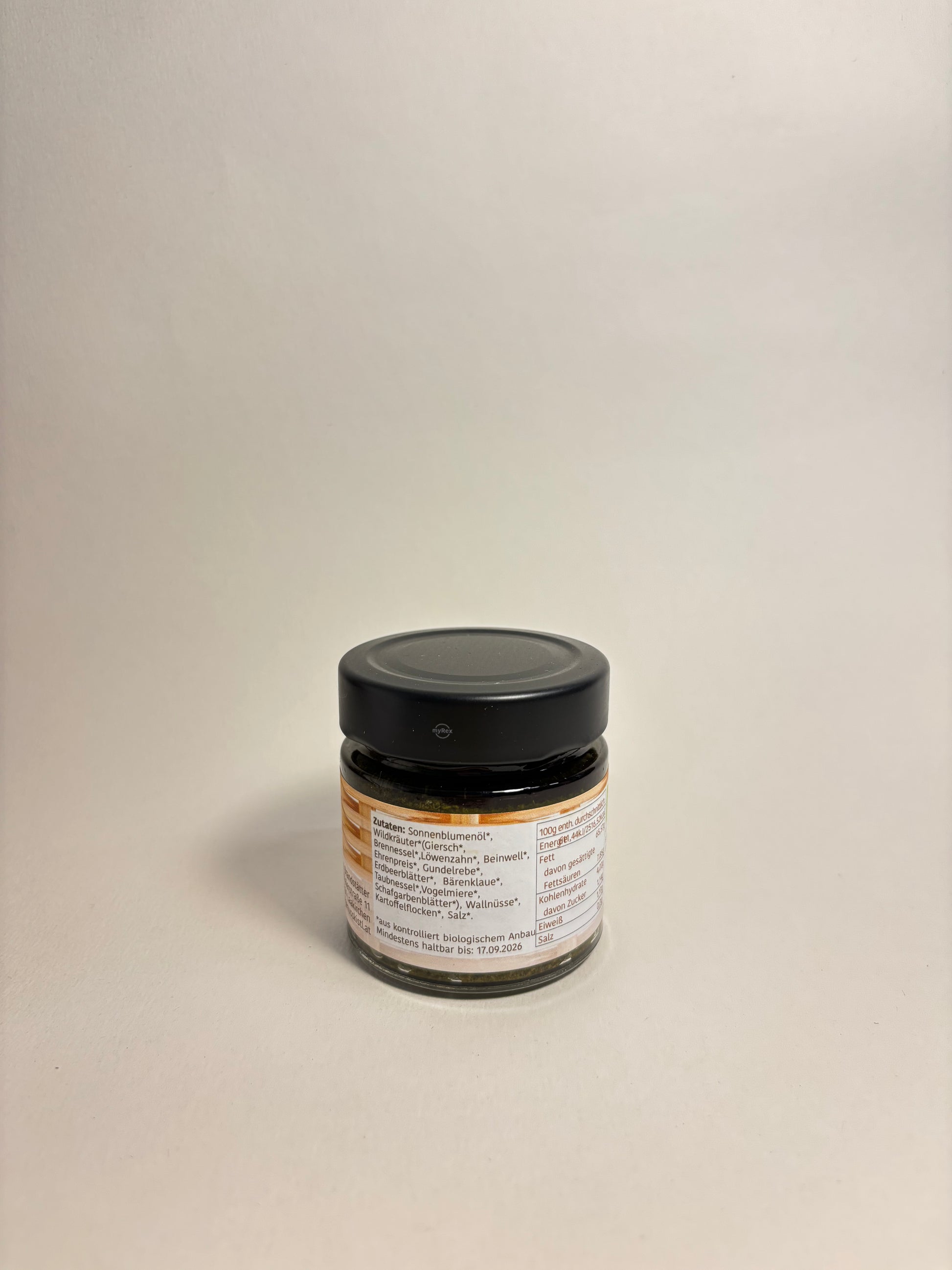 Zutaten: Sonnenblumenöl*, Wildkräuter* (Giersch*, Brennessel*, Löwenzahn*, Beinwell*, Ehrenpreis*, Gundelrebe*, Erdbeerblätter*, Bärenklaue*, Taubnessel*, Vogelmiere*, Schafgarbenblätter*), Walnüsse*, Kartoffelflocken*, Salz.
